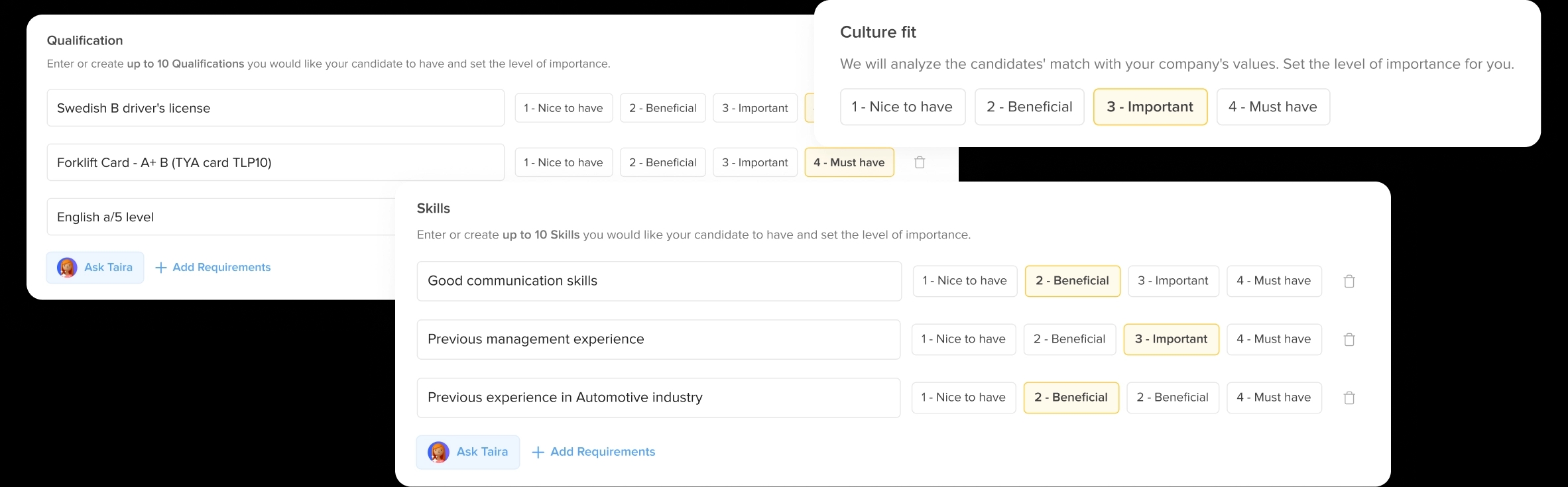 Tailor Taira’s screening criteria to meet your unique hiring needs. Whether you’re looking for specific skills, certifications, or experience levels, Taira adapts to your requirements, delivering candidates who match your exact standards.
